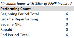 This week we will be initiating a PFNF principal distribution for $500k, which represents ~2.3% of the remaining PFNF note balance. We’ve now returned 69.6% of all PFNF principal since we began this distribution plan. Interest collected on the portfolio this period was $22,509 and has been included in the distribution.