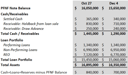 We continue to be optimistic that the uptick in recent liquidity will continue through the end of the year and into the early part of next year. In addition to the recent payoffs, we have also continued to make progress on working additional loans towards dispositions, particularly with properties that are now REO. We currently have ~$5M of PFNF loans that are REO and listed or under contract to be sold. Our current forecast expects to have another ~$1M+/- resolve before the end of the year. We also continue to advance more loans through the foreclosure process and have gotten them to REO status which brings us closer to final disposition as well. We are also continuing to run parallel disposition strategies (i.e. loan sales, bulk REO sales, workouts, etc.) on the portfolio where and when it makes sense.