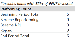 The overall loan portfolio decreased by $4.5M in the last month. We started the period with 8 performing and 63 non-performing loans, 24 of which are now REO. We had one performing loan become non-performing. One performing and 6 non-performing/REO loans repaid this period. The below tables show the movement of loan counts for the period.